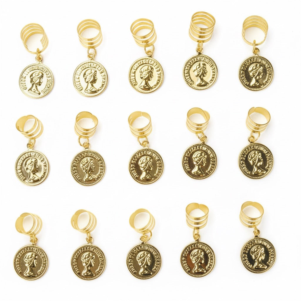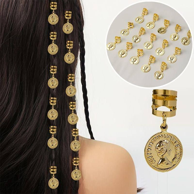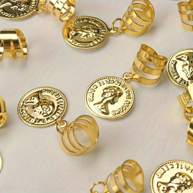 Add a touch of royalty and shine to your hairstyle with these exquisite gold-toned hair cuffs. Each pack contains 6 beautifully crafted pieces, with each spiral cuff featuring a detailed coin pendant. Perfect for enhancing braids, dreadlocks, twists, and other protective styles, these charms are easy to install and adjust. They are the ideal accessory for festivals, events, or everyday glamour, offering both elegance and